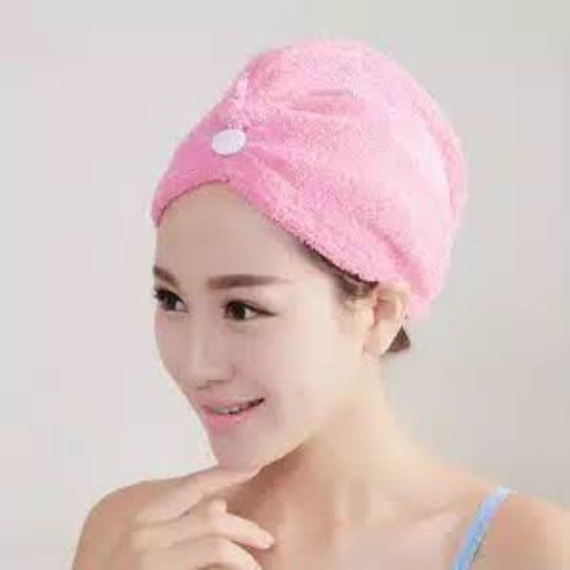 Handuk keramas untuk kepala,ber ukuran kecil, dilengkapi dengan kancing dan pengait.